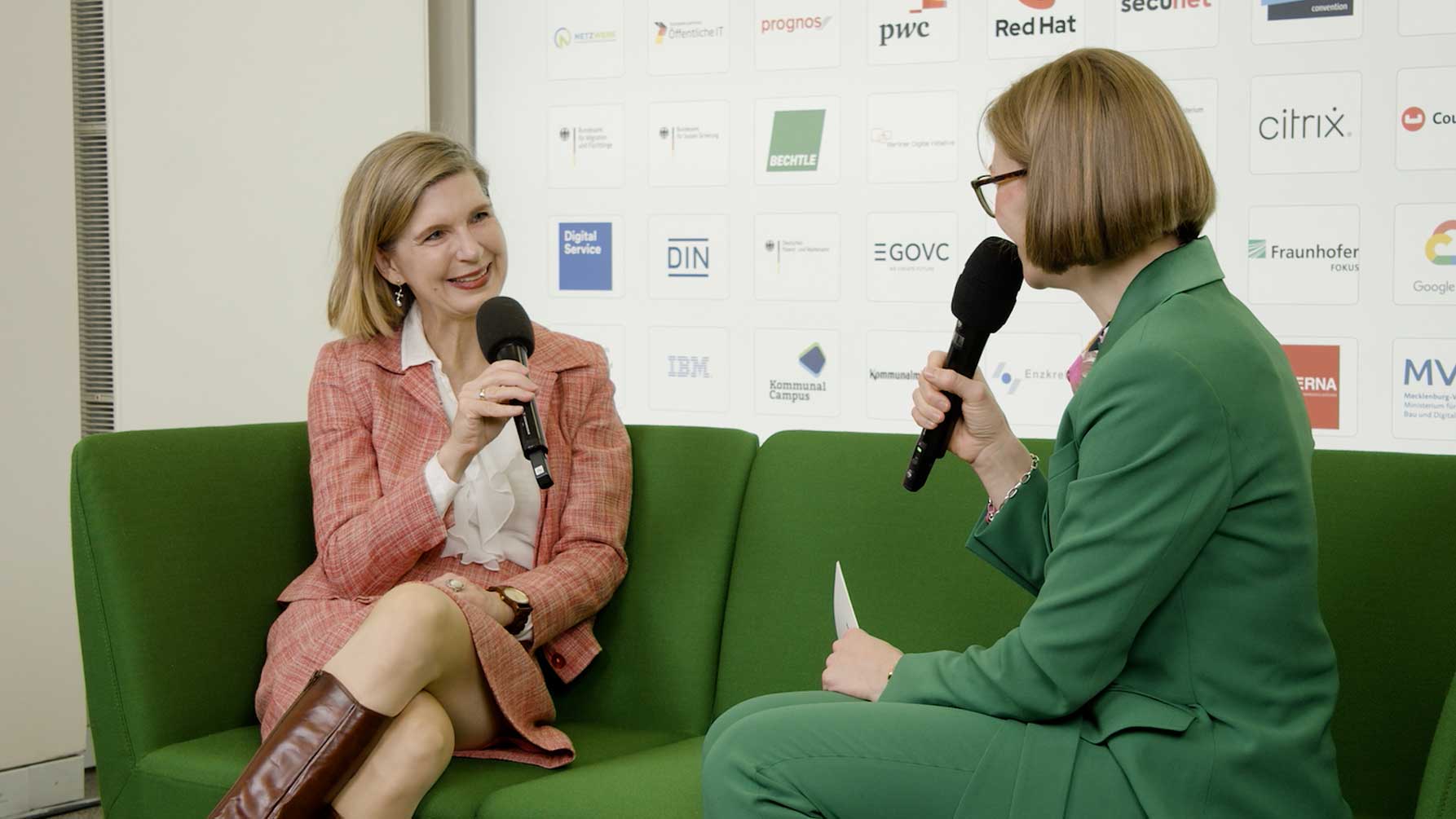 Renate Mitterhuber, Referatsleiterin Smart Cities, beim Bundesministerium für Wohnen, Stadtentwicklung und Bauwesen spricht auf dem Grünen Sofa über die unterschiedlichen Digitalisierungsentwicklungen und -potenziale in Quartieren und Städten. Mitterhuber macht deutlich, dass der Wissensaustausch zwischen Smart Cities ein entscheidender Erfolgsfaktor ist. Dabei leisten vor allem die Wissenstransferangebote und Workshops des BMWSB einen wesentlichen Beitrag zu Fortschritt und Vernetzung.